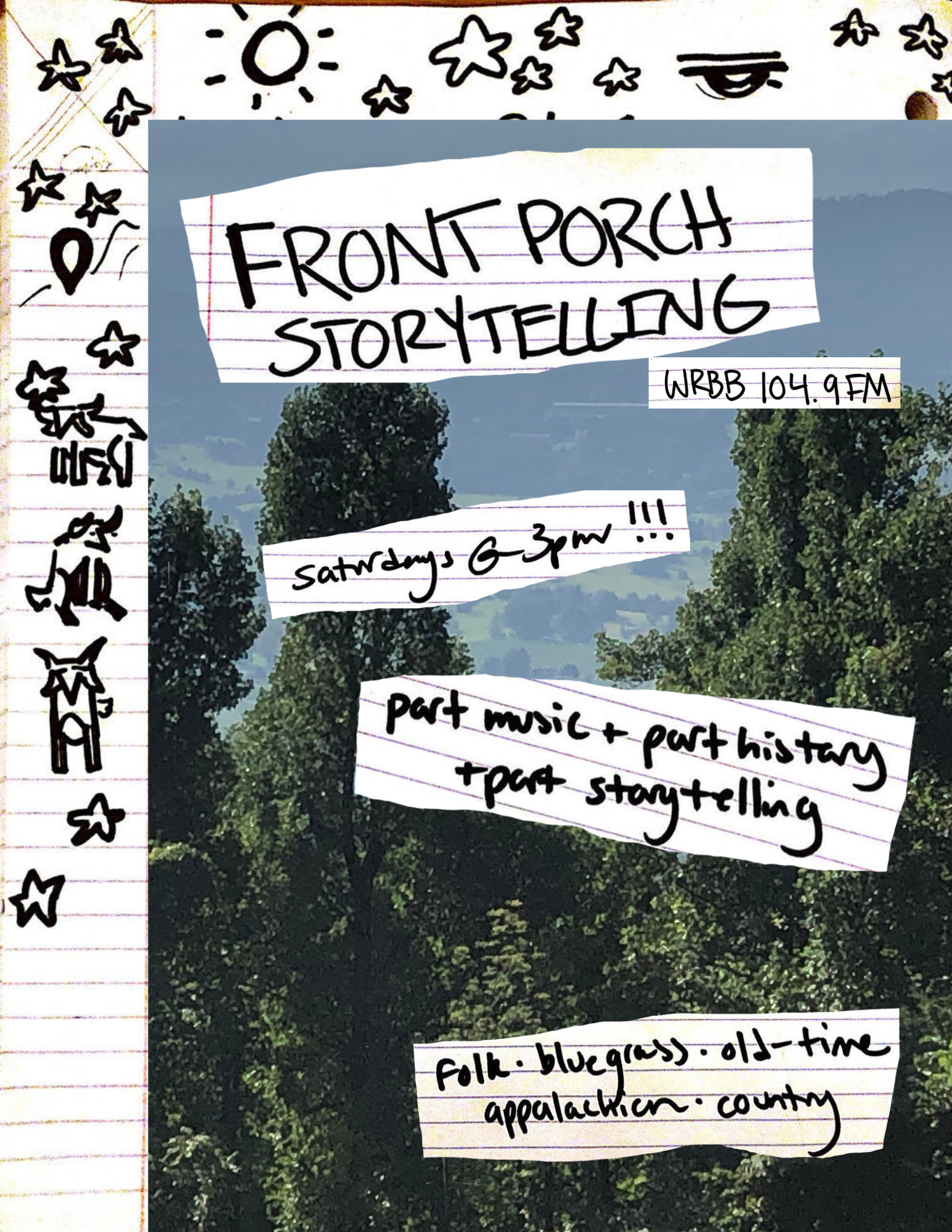 i run a radio show (currently at 2pm eastern time every monday) on WRBB 104.9FM. called front porch storytelling, it's a weekly hour long show on the history, stories, and evolution of old-time to bluegrass to country music, and other country subgenres! here's some fliers i've made for the show- feel free to click through them to get an idea of what i talk to myself about for an hour every week >>>>